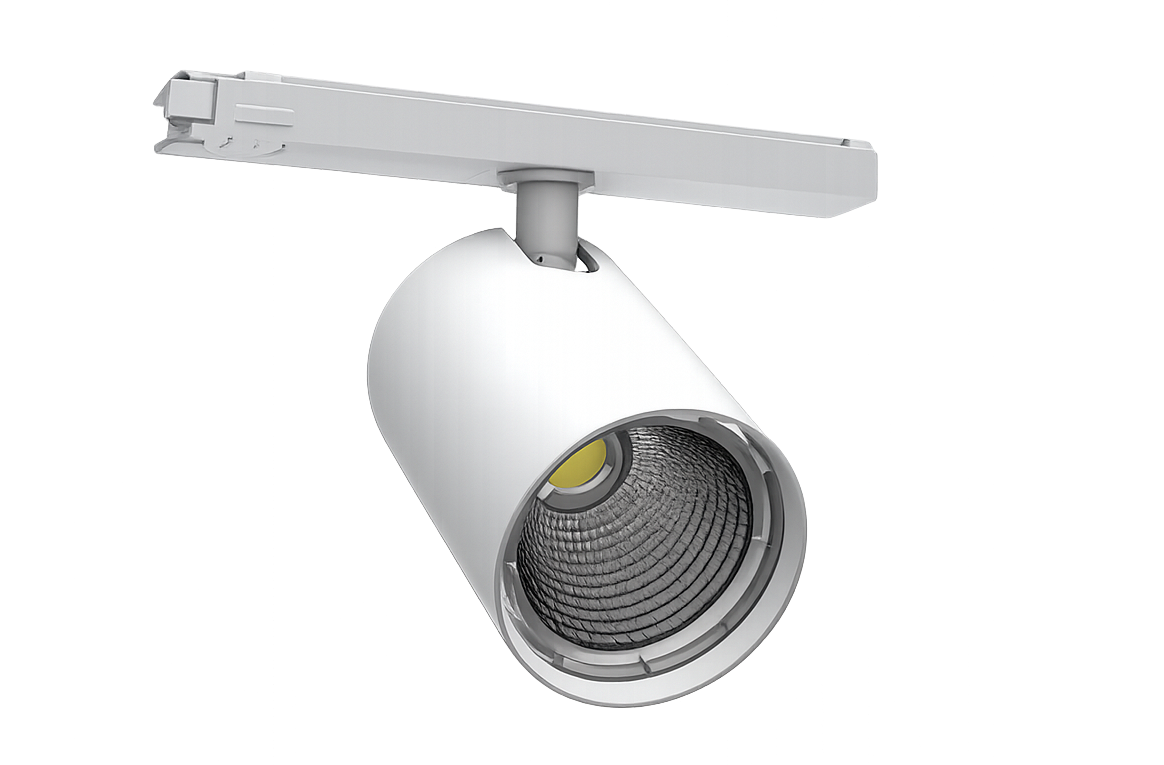 Son corps cylindrique en aluminium favorise une dissipation thermique efficace, garantissant stabilité photométrique et longévité du système. Le montage sur rail permet une installation flexible et un repositionnement rapide, adapté aux environnements commerciaux, tertiaires et architecturaux.